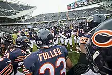 The annual Family Fest at Soldier Field was held on August 2 in front of 27,000 spectators. Long made his return at the event, along with Garza, while Shaun Draughn was not present for personal issues. Jared Allen and Ratliff were excused.[101] Later practices were held in Bourbonnais from August 4–6, with the first preseason game on the following day. On August 4, Jeffery, Britton, Conte, Steltz, and Draughn did not practice, while Lance Briggs bruised a knee;[102] the first major injury of Training Camp was Marquess Wilson's broken clavicle.[103] During the session, a fight between Martellus Bennett and Kyle Fuller occurred: while attempting to force Bennett to fumble, Fuller grabbed Bennett's shoulder pad, pulling him down. In retaliation, Bennett body-slammed Fuller, causing Lamarr Houston, Matt Forte and Zach Miller, along with offensive coordinator Aaron Kromer to intervene. Head coach Marc Trestman would end the practice earlier than scheduled. The next day, Bennett was indefinitely suspended by the team.[104] August 5's practice featured Britton, Briggs, Allen, and Draughn being absent, while Jordan Mills injured his foot prior to the end of the workout.[105] On August 6, Long, Isaiah Frey, Mills, Britton, Jennings, Steltz, Conte, and Allen did not practice.[106] The final practices would be held from August 10 to 12.[92] Bennett was reinstated and practiced on August 10,[107] while Steltz and Conte returned to practice.[108] However, Mills, Britton, Chris Williams, Frey, and Brian de la Puente did not practice.[109] The five, Wilson, and Briggs did not work out the next day, with Briggs being given a day off.[110] August 12's practice had Williams, Britton, Mills, Wilson, Frey, Dante Rosario, Tillman, and Ratliff out.[111]