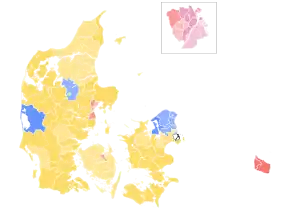 The Social Democrats with 19.1% of the votes lost one seat and got three. Their strongest performance was in Eastern Jutland, Bornholm and Copenhagen.[12] The Socialist People's Party which lost one of their two seats had their strongest performance in the same area.[12]