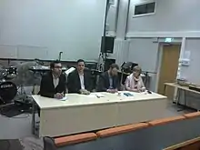Hustings panel for the European Parliament election in Haaga primary school, Helsinki, Finland, 15 April 2014. From left to right: Ozan Yanar (Greens), Jukka Mattila (panel moderator), Timo Harakka (Social Democratic Party), Marjatta Rasi (National Coalition Party).