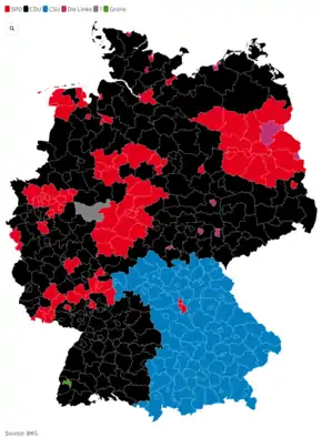 The previous electoral threshold of 5% was ruled unconstitutional in 2011, leading the major parties to implement a 3% threshold instead. However the Constitutional Court ruled on 26 February 2014 that this threshold was illegal as well.[2] Under this circumstances a vote share of 0.6% proved sufficient to win an EP seat (result of Die PARTEI) and seven parties won single seats; the seats were allocated according to the Webster/Sainte-Laguë method.
