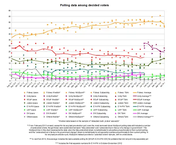 - This poll has 17% undecideds, of which 10% fully undecided and 7% undecided but in favour of a change in government. In addition, this time the Nézőpont poll also provides data for "potenciális szavazók", which add up to 100%, leaving no number of undecided voters. The proportions are substantively different in this data, to the advantage of the MSzP: Fidesz 44%, MSzP 25%, Jobbik 14%, LMP 6%, DK 3%, E2014 7%.