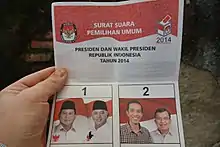 Arrangements for the conduct of elections in Indonesia are carried out under the supervision of the KPU.[7] The presidential elections in 2014 were carried out under the 2008 election law (Undang-undang, or UU) No. 42 on the election of a president and vice president.[8]
