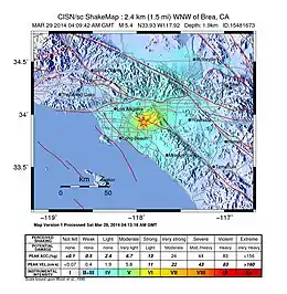 The 2014 La Habra earthquake was a magnitude 5.1 earthquake that occurred on March 28, 2014, at 9:09:42 p.m. PDT. Although given the name "La Habra" it was centered in Brea, a city in northern Orange County.[2] Despite its moderate magnitude, it had a maximum Mercalli intensity of VII (Very strong), and caused a total of $10.8 million in damage.[1][2] Thirteen water mains broke in Fullerton, forcing roughly 70 families to be displaced from their homes after they were declared temporarily uninhabitable.[1]