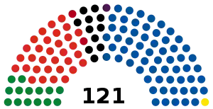 The centre-right National Party, led by incumbent Prime Minister John Key, gained a plurality with 47.0% of the party vote and 60 of the 121 seats. On election night counts, the party appeared to hold the first majority since 1994 with 61 seats, but lost one seat to the Green Party on the official count.[7] National re-entered confidence and supply agreements with the centrist United Future,[8] the neoliberal ACT Party,[9] and the indigenous rights-based Māori Party[10] to form a minority government and give the Fifth National Government a third term. This was the most recent election in which a National Party member was appointed prime minister.