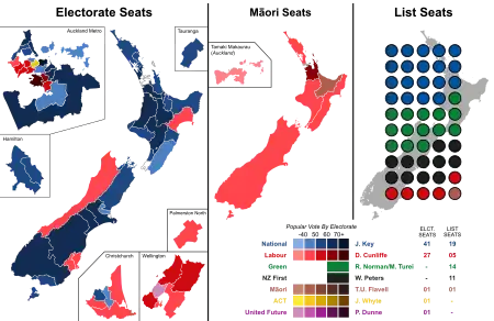 ![]() Map of the general election. Electorate results are shown on the left, Maori electorate results in the centre, and the additional members on the right. | ||||||||||||||||||||||||||||||||||||||||||||||||||||||||||||||||||||||||||||||||||||||||||||||||||||||||||||||||||||||||||||||||||
