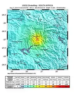 The earthquake occurred at 12:22:33 SAST on 5 August 2014, with the epicentre near Orkney, a gold mining town in the Klerksdorp district in the North West province of South Africa. The shock was assigned a magnitude of 5.5 on the Richter scale by the Council for Geoscience (CGS) in South Africa,[2][8][9] making it the biggest earthquake in South Africa since the 1969 Tulbagh earthquake,[10] which had a magnitude of 6.3 on the Richter scale.[11] The United States Geological Survey (USGS) estimated a focal depth of 5.0 km (3.1 mi).[1] The CGS reported 84 aftershocks on 5 August and 31 aftershocks on 6 August, with a magnitude of 1.0 to 3.8 on the Richter scale.[5]