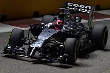 There were three evening practice sessions—two 90-minute sessions on Friday and a single 60-minute session on Saturday—preceding Sunday's race.[16] In the first practice session, Alonso lapped fastest at 1 minute, 49.056 seconds, one-tenth of a second quicker than Hamilton in second. Rosberg, Vettel, Ricciardo, Jean-Éric Vergne, Kimi Räikkönen, Jenson Button, Daniil Kvyat and Sergio Pérez were in positions two through ten.[17] Although several drivers narrowly avoided damaging their cars, the session passed relatively smoothly.[18] Vergne's battery was changed, causing him to miss the first hour. After setting his fastest lap, he stopped with an energy recovery system failure, ending his session early.[17] Räikkonen's session also ended early with brake fire. Vettel stopped at the pit lane exit with a sudden loss in oil pressure; he avoided a ten-place grid penalty because he used an older engine.[17][18]