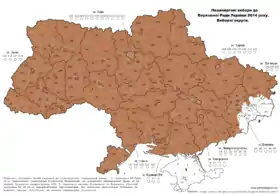 Voting did not take place in the Russian-occupied Autonomous Republic of Crimea and Sevastopol, nor in large parts of Donetsk and Luhansk oblasts because of the ongoing war in Donbas.[3] Because of this, 27 of the 450 seats remained unfilled.