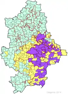 Light green coloured parts of the Donetsk Oblast took part in the Ukrainian parliamentary election, purple coloured parts in the 2 November Donetsk People's Republic elections and yellow parts took part in neither.