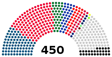 The Verkhovna Rada has 450 members, elected to a five-year term in parallel voting, with 225 members elected in single-member constituencies using FPTP system and 225 members elected by proportional representation (closed list) in a single nationwide constituency using the largest remainder method with 5% threshold.[17] Parties are not allowed to form electoral blocs (in contrast to 1998-2007 elections). Attempts to return to proportional representation with open party lists and electoral blocs were failed.[18]