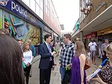 Ed Miliband talks to a local couple whilst campaigning in Crawley during the run up to elections - 22 May