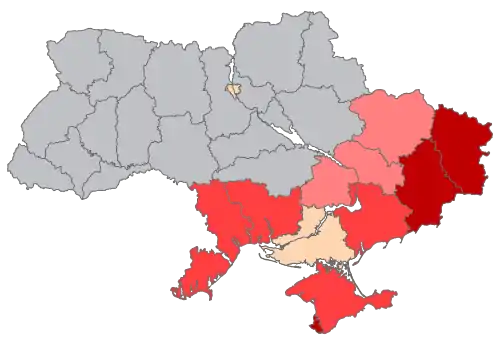Opposition to secession from Ukraine and annexation by Russia (the combined percentage for the people opting for the options of "Rather, no" and "Certainly, no, I don't") had these percentages in various southern and eastern Ukrainian oblasts:[39]