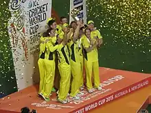 The final of the 2015 Cricket World Cup took place on 29 March 2015 at the Melbourne Cricket Ground in Melbourne, Australia. It was played between the tournament's two co-hosts, New Zealand and Australia. Australia went into the game as favourites[2][3] and won by 7 wickets for a fifth World Cup triumph. The match was played in front of 93,013 spectators, a record crowd for a day of cricket in Australia.
