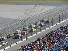 Kyle Busch was the fastest in the third practice session with a time of 44.826 and a speed of 200.776 mph (323.118 km/h).[26] During this session, there was a four car wreck on the backstretch that involved Michael Annett, Jeb Burton, Denny Hamlin and Danica Patrick.[27] It started when Hamlin pulled out of line and Patrick tried to follow him, but made contact with the right-front corner of Hamlin's car when she over-corrected and hit the wall. Michael Annett tried to go high around Patrick on the outside when he got turned by Jeb Burton. Patrick, Annett and Burton all switched to backup cars.[27] After the incident, Patrick stated that her car "sort of just started turning toward the right, the back end was coming around and it swapped ends" and that Hamlin was trying to "make a third lane in the middle and it felt like it must have caught my bumper".[27] Hamlin felt that Patrick had intended to block his path, stating that a driver has "to give a little bit of extra room in practice" and that if he "had to guess, she probably saw in her mirror that I was going down there and tried to stay in front of me".[27]