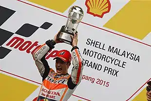 On the post-race podium, Lorenzo was booed by the crowd as he collected his second-place trophy and his teammate Rossi declined to speak to the media in the later press conference.[40] Lorenzo then proceeded to leave the podium and later explained to the press that this was not because of the booing but due to him suffering from exhaustion from the high ambient temperatures and humidity that is often dealt with in Malaysia.[41] Two weeks later at the season-ending Valencian Community Grand Prix, Lorenzo apologised for appearing to make a thumbs down gesture at teammate Rossi on the podium, "I regret that. It's not a sporting example, especially for young people watching MotoGP around the world."[42] Pedrosa spoke about his happiness over taking his second victory of the season and stated that he set-up his bike similar to that of the pre-season test session at Sepang in February, "We had a good feeling from Friday, we were able to manage the weekend well and above all we had a bike that worked very well during every practice.", and, "I am especially pleased to finish the season very positively, as it has been a hard year but we are now recovering well and we're in good form."[43]