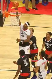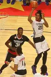 At the time of the roster announcement the 24 players included 22 of the top 25 players according to the 2015 ESPN 100.[4] The two highest rated players (Ben Simmons and Jaylen Brown) were both named to the East team.[4][5] The West team roster was highlighted by Malik Newman.[3] Based on ratings at ESPN.com, the highest rated eligible player not invited was number 18 ranked Texas A&M signee Tyler Davis.[4] However, according to 247Sports.com's composite ranking, the highest rated non-invitee was 15th-ranked Arizona signee Ray Smith.[5] Nine uncommitted players at the time of the roster announcement was regarded as a high total and was higher than the total of two the year before.[4][5] Kentucky signee Skal Labissière (number 3 at ESPN and number 5 at 247Sports.com) was not eligible due to his athletic ineligibility after transferring.[4][5] As of gametime, 8 players remained undecided on their college affiliations.[6] 5 of the players were scheduled to begin play in the Dick's Sporting Goods High School Nationals the following day.[7]