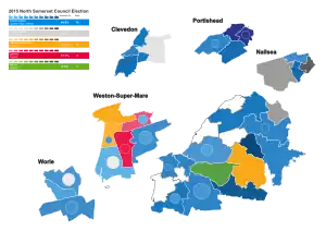 ![]() Map of the results of the 2015 North Somerset council election. Conservatives in blue, independent in grey, Liberal Democrats in yellow, Labour in red and Green Party in green. | |||||||||||||||||||||||||||||||||||||||||||||||||||||||||||||