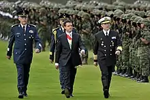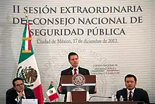 On 20 March, Secretary of the Interior Miguel Ángel Osorio Chong posted a message in his Twitter account thanking the five officers killed in the ambush for their commitment to their duty.[72] He also sent his condolences to the officers' families and colleagues,[73] and stated that the government was working diligently to ensure public security.[74] The same day the head of the CNS, Renato Sales Heredia, instructed National Gendarmerie chief Manelich Castilla Craviotto and Jalisco attorney general Jesús Eduardo Almaguer Ramírez to hold a ceremony at the scene where the ambush occurred in memory of the officers killed. Along with the mayor of Ocotlán, members of the Mexican Army, and other members of the PF, they publicly recognized their work, and stated that the crimes would not go unpunished. They stated that the government was committed to restoring peace in Mexico and that the ambush had helped to unify Mexico's security forces. At the end of the ceremony, civilians and government officials held a moment of silence in memory of the officers and civilians killed. This ceremony was carried out simultaneously with others at the PF headquarters in Mexico City and in other National Gendarmerie stations.[75]