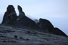 During the earthquake, one of the peaks on Mount Kinabalu (called the Donkey's Ears) was broken off.[12] The source of the Poring Hot Springs a popular tourist area near Ranau, turned murky and black[48] for a few hours due to the earthquake, which disrupted a clay deposit that interrupts the fault gap that heats up the rainwater.[21] Some infrastructure was reported damaged with around 23 schools in six different districts affected, and Ranau Mosque was also damaged due to the tremor.[49][50]