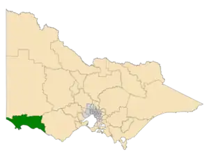 ![]() The electoral district of South-West Coast in south-west rural Victoria is dominated by the town of Warrnambool, but also includes Portland, Port Fairy, Koroit, Heywood and Macarthur. | |||||||||||||||||||||||||||||||||||||||||||||||