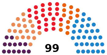 Voting for the Corts was on the basis of universal suffrage, which comprised all nationals over 18 years of age, registered in the Valencian Community and in full enjoyment of their political rights. Additionally, Valencians abroad were required to apply for voting before being permitted to vote, a system known as "begged" or expat vote (Spanish: Voto rogado).[2] The 99 members of the Corts Valencianes were elected using the D'Hondt method and a closed list proportional representation, with a threshold of five percent of valid votes—which included blank ballots—being applied regionally. Parties not reaching the threshold were not taken into consideration for seat distribution. Seats were allocated to constituencies, corresponding to the provinces of Alicante, Castellón and Valencia, with each being allocated an initial minimum of 20 seats and the remaining 39 being distributed in proportion to their populations (provided that the seat-to-population ratio in any given province did not exceed three times that of any other).[1][3]