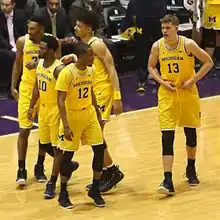 On November 4, the team played an exhibition game against Armstrong State, winning 77–49. Wagner and Irvin led the team with scoring in the exhibition with 15 points each.[66] Muhammad-Ali Abdur-Rahkman sat out the exhibition with an ankle injury.[67] Michigan opened the season on November 11 against Howard, winning 76–58. Derrick Walton led the team in scoring with 20 points, including four three-pointers, while D.J. Wilson led the team in rebounding with eight rebounds to go along with nine points playing in 20 minutes off the bench. Additionally, Rahkman returned from his ankle injury reclaiming his spot in the starting line-up.[68] On November 13, Michigan defeated IUPUI, 77–65. Zak Irvin led the team in scoring with 15 points, as four Wolverines finished the game with double-digit points, while Wilson led the team in rebounds with 14, to go along with seven points and five blocks playing in 30 minutes off the bench.[69] In the semifinal round of the 2016 2K Sports Classic held at Madison Square Garden on November 17, Michigan defeated Marquette 79–61 behind a team-high 16 points from Irvin and 4 other double digit scoring efforts, including D. J. Wilson's first career double-double (10 points and 12 rebounds).[70][71] The following night, Michigan won the tournament by defeating SMU 76–54. Walton made seven three-point shots and scored 23, while Irvin added another 16 to earn tournament MVP.[72][73] On November 23, Michigan suffered its first loss of the season to South Carolina, 46–61. Michigan was led by Walton with a team-high 15 points. Michigan scored 24 of its 46 points from the free throw line, shooting just 19 percent (10-for-52) from the field, including 2-for-26 from three-point range.[74] On November 26, Michigan defeated Mount St. Mary's, 64–47. Michigan was led by Irvin with 14 points, as the Wolverines used a 25–4 run to turn a four-point deficit into a 17-point halftime lead.[75] On November 30, Michigan lost to Virginia Tech 70–73 in the ACC–Big Ten Challenge. Michigan was led by Irvin with a game-high 23 points, as the Hokies rallied from a nine-point deficit at halftime to take their first lead of the game with 1:46 remaining and hold on to win.[76]