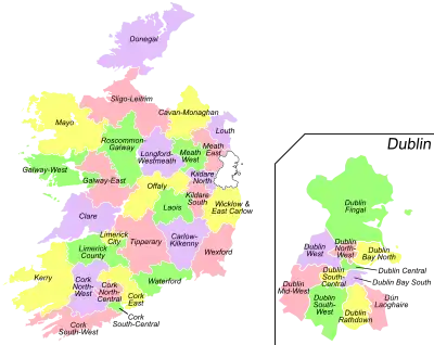 Ireland uses proportional representation with a single transferable vote (PR–STV).[27] The general election took place throughout the state to elect 158 members of Dáil Éireann, a reduction of 8 from the previous 166 members. This follows the passage of the Electoral (Amendment) (Dáil Constituencies) Act 2013. The Ceann Comhairle (speaker of the lower house of parliament) is automatically re-elected unless he opts to retire from the Dáil.[28] The election was held in 40 parliamentary constituencies.[29] Each multi-member constituency elects three, four or five Teachtaí Dála (Dáil deputies, lit. Assembly Deputies).[27]