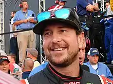 Kurt Busch scored the pole for the race with a time of 27.505 and a speed of 196.328 mph (315.959 km/h).[16] He said the car "was insanely fast. It’s amazing all the detail that goes into qualifying with finding that perfect lap three times out there. My second outing we were way tight and I didn’t know where it came from. “(Tony) Gibson, (crew chief) and crew went to town. They just adjusted on it. We gambled and we made that last session, which was great. That was icing on the cake to be able to go out into the third round. I was first or 12th it didn’t matter.”[17] Joey Logano said that second for him was "so close. Second always stings the most. I felt like that last run I just – I told Todd that our car was close I just had to want it more. I pushed as hard as I could and got a little tight in one and two and that was enough to give up that speed we needed to get the pole tonight. I am so proud of what this Pennzoil team has done to pick up over last week. Dang it. It is so close. It was a lot of fun out there tonight and we are looking forward to Sunday.”[17] Kyle Busch, who described his car as being "out of control" after qualifying 23rd, said that his "front tires were chattering, and there wasn’t much we were going to do to fix that out there."[18] Carl Edwards switched to a backup car after making contact with the wall in the session.[19] Because this took place after qualifying, he'll start from the rear of the field.[19] He said that going to his backup was "frustrating because the car was really fast but they say the back-up is just as fast. I guarantee that car will be as good as this one."[20]