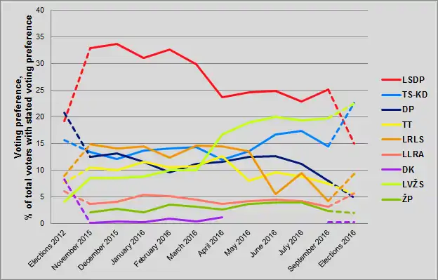 19. "Paskutinė apklausa prieš rinkimus: socialdemokratų atotrūkis ištirpo" [The last poll before the elections: Social Democrats' advantage has melted away]. delfi.lt (in Lithuanian). 4 October 2016. Retrieved 4 October 2016.