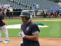 On May 9, closer Aroldis Chapman made his Yankees debut, pitching one inning and allowing one earned run on two hits.[20] The vaunted bullpen trio of Dellin Betances, Andrew Miller and Chapman became known in the media as "No-Runs DMC", a nod to the Queens hip-hop group Run–D.M.C.[21] On May 16, Carlos Beltrán recorded his 400th career home run.[22] On May 29, the Yankees beat the Rays 2-1 with only one hit, a Starlin Castro 2-run home run, the first time the Yankees won with only hit since 1914.[23]