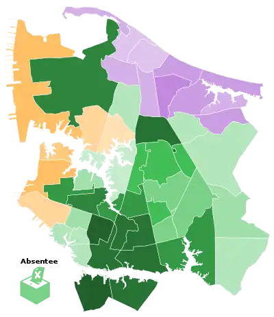 ![]() 2016 Norfolk Mayoral Election with results colored by precinct. Green for Kenny Alexander, orange for Andy A. Protogyrou, and purple for Robert James McCabe. | |||||||||||||||||||||