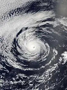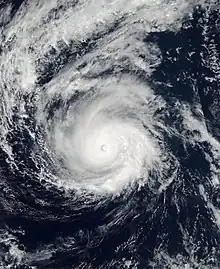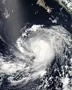 On July 15, the NHC noted that an area of low pressure was forecast to form well south of Mexico early the subsequent week.[88] An area of disturbed weather became established south of the Gulf of Tehuantepec the following day,[89] organizing sufficiently to be deemed a tropical depression by 21:00 UTC on July 21.[90] Despite moderate northeasterly wind shear, the depression intensified into Tropical Storm Georgette by 15:00 UTC on July 22 and was further upgraded to a Category 1 hurricane by 03:00 UTC on July 24.[91][92] Over a 24-hour period ending at 03:00 UTC July 25, the cyclone's maximum winds increased from 75 mph (120 km/h) to a peak of 130 mph (210 km/h) as convection became more symmetric and an eye cleared.[93] Progressively cooler waters and a more stable environment, however, caused Georgette to begin weakening soon thereafter: it fell below hurricane intensity by 15:00 UTC on July 26 and further degenerated into a remnant low well west-southwest of Baja California a day later.[94][95]