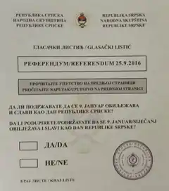 A referendum on the National Day of Republika Srpska (RS), called the "Day of Republika Srpska" (Serbo-Croatian: Dan Republike Srpske, Дан Републике Српске, or Dan RS) was held on 25 September 2016. The Constitutional Court of Bosnia and Herzegovina had on 26 November 2015 ruled against the constitutionality of the holiday, deeming it discriminatory against non-Serbs in the entity. The Day of RS falls on 9 January, which is both an Orthodox feast day and the date when the Bosnian Serb republic was declared in 1992 although Serbian Orthodox Church venerates saints on each day in a year. The result was 99.8% in favour of keeping the date.