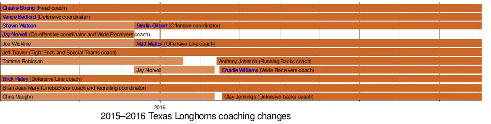Towards the end of the 2015 season, Texas' administration reportedly began showing interest in hiring then TCU co-offensive coordinator Sonny Cumbie to serve as an offensive coordinator for the Longhorns in 2016.[5] This interest culminated in several meetings and an eventual offer by Charlie Strong in early December 2015; Cumbie eventually turned down the offer.[6] Concurrently, the Longhorns administration expressed interest in Tulsa co-offensive coordinator Sterlin Gilbert for the same job at Texas, among other candidates. Despite media reports suggesting that Gilbert took the Texas job on December 11, later reports from the same day indicated that Gilbert had also turned down the coaching offer.[7] Allegedly, inconsistencies with the exact terms of the offer led to Gilbert's initial refusal. However, further negotiations between Texas and Gilbert resulted in the official announcement of Texas' hiring of the former Tulsa offensive coordinator, along with Gilbert's offensive line coach, Matt Mattox, on December 12, 2015. Consequently, offensive coordinator Shawn Watson and offensive line coach Joe Wickline, who had remained a part of the Texas coaching staff since 2014, were released.[8]