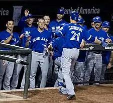 Shortly after pitchers and catchers reported to Dunedin for the start of spring training on February 22, José Bautista addressed the media regarding his contract situation. Bautista, in the final year of a five-year, $65 million contract, stated that he had told the Blue Jays the length of contract he was seeking as well as the compensation of said contract, and that he would not negotiate or agree to a "hometown discount".[48] The following day, TSN's Rick Westhead reported that Bautista had requested a five-year, $150 million contract.[49] The report was later refuted by Bautista.[50] While Bautista's contract situation was unfolding, the Blue Jays, Los Angeles Angels of Anaheim, and Cincinnati Reds were reported to be in agreement on a trade that would have sent Michael Saunders to the Angels, Jay Bruce to the Blue Jays, and unnamed prospects from the Angels and Blue Jays to the Reds. Hours after the trade was made public, reports surfaced that the deal was on hold due to issues with an unknown player's physical.[51]