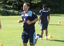 Despite being unable to prevent relegation as caretaker-manager the previous season, Michael Brown was confirmed as the club's new permanent manager in May 2017; incumbent assistants David "Ned" Kelly and Chris Morgan also retained their positions, as did chief scout Darren Wrack.[3] Brown said that the budget available left him with "a good chance of gaining promotion".[4] His first summer signing was former two-time Player of the Year Tom Pope on a free transfer after he managed to secure his release from Bury.[5] He made his second signing four weeks later, goalkeeper Rob Lainton, who also arrived on a free transfer from Bury.[6] Also arriving were Colombian winger Cristian Montaño, released from Bristol Rovers, and former Vale youth centre-back Joe Davis, on a free transfer from Fleetwood Town, and 22-year old Burton Albion goalkeeper Sam Hornby.[7][8][9] These signings were quickly followed by the arrival of 19-year old Sheffield United left-back Graham Kelly.[10] A third Bury player also arrived in the form of 34-year old centre-back Antony Kay, a veteran of over 600 professional matches.[11] However Brown also revealed that defender Kjell Knops had picked up an infection in his knee and would miss the entire season after undergoing surgery.[12]