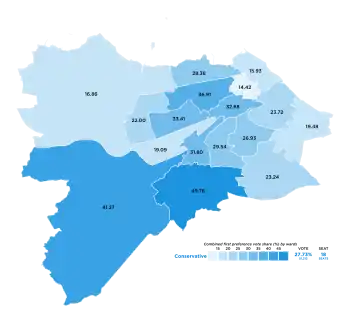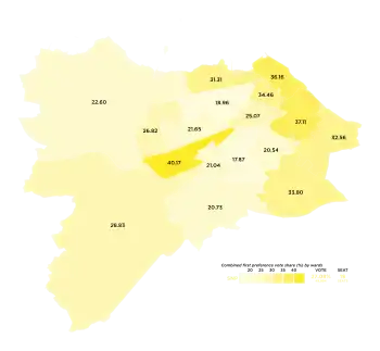 | Ward | % | Seats | % | Seats | % | Seats | % | Seats | % | Seats | % | Seats | Total |