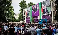 Foreign policy has traditionally come second to domestic issues in Iranian presidential elections. Yet ever since the 2013 presidential election, foreign policy debates have come to the fore. Four years before, Hassan Rouhani ran for president with a symbolic key to open the doors to resolve Iran's mainly economic challenges. During the 2013 election, Rouhani argued that many difficulties were rooted in the country's foreign policy, declaring that it's time for foreign policy to serve Iran's economy. He also said in yet another highly symbolic sentence that the spinning of uranium enrichment centrifuges is valuable once the economy's wheels also spin. Therefore, his foreign policy agenda focused on resolving both the nuclear issue and easing tensions with Iran's Arab neighbors. Nonetheless, resolving the nuclear issue through engagement with six world powers came first, paying off with the signing of the 2015 JCPOA deal.[5] Despite the criticisms at the debate, Rouhani is believed to have a stronger foreign policy than the opponents.[5]