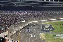 Racing resumed once again on lap 198, where Power almost immediately moved back around Dixon to once again take the lead of the race. Caution came out again only three laps later, as Newgarden attempted to complete a three-wide pass in turn 3, which resulted in him hitting the wall in turn 4.[12] Racing resumed on lap 210, with Power maintaining his lead, while second place became a battle between Pagenaud, Dixon, and Sato, with Dixon emerging ahead. This caution also put Kanaan back onto the lead lap. On lap 225, the final competition caution of the race came out, with the top five staying the same after the mandatory pit stops. The final restart of the race came at lap 229, with Dixon quickly moving to the outside of Power to challenge for the lead. The two switched the lead several times, while behind them, Pagenaud, Sato, Rahal, and Kanaan pulled up behind the duo and also began challenging for first. With five laps to go, Sato attempted to pass Dixon in the dogleg on the front-stretch, but clipped the grass,[12] sending him into a spin and collecting Dixon and Chilton.[16] Conor Daly also spun in the incident, but did not hit anything, though the incident caused him to drop a lap.[17] Chilton was able to complete two more laps before heading into the pit lane.[18] With so few laps left, the race ended under caution, with Power taking his second victory of the year and his second win at Texas Motor Speedway.[19] Kanaan, despite his role in two incidents, came across the line in second, while Pagenaud took the final step of the podium. Only three other drivers finished on the lead lap; Rahal in fourth, Chaves in fifth, and Marco Andretti in sixth.[12][20]