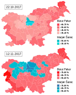 Presidential elections were held in Slovenia on 22 October 2017. Nine candidates ran in the first round of the elections, in which the incumbent independent President Borut Pahor placed first and Marjan Šarec of the List of Marjan Šarec (LMŠ) placed second. No candidate received a majority of the vote in the first round, resulting in a run-off between Pahor and that was held on 12 November 2017.[1] Pahor won the run-off with 53% of the vote;[2] voter turnout in the second round was 42.13%, the lowest in any presidential election since independence.[3]