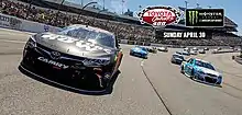 Matt Kenseth led the field to the green flag at 2:16 p.m. Erik Jones made contact with Kasey Kahne exiting Turn 2 on the first lap, leading to a left-front tire cut and slamming the wall on the seventh lap of the race.[17] Jones, after being released from the infield care center, said he and Kahne, were "three-wide right on the start and then the 5 ran us up into the fence. I was trying not to wreck everybody and then a couple laps later the GameStop Prey Toyota Camry cut a left-front tire. It’s just really a heartbreaking day. It’s not what we wanted, but we’ll just have to come back next week with another fast race car and try to run up front again.”[18] He went on to finish last.[19]