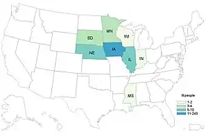 265 people in 8 states were identified to carry similar Salmonella Typhimurium strains,[2] predominantly in Iowa (240 cases). Additional cases appeared in Illinois (10), Nebraska (5), Minnesota (4), South Dakota (3) and in Indiana, Mississippi and Wisconsin, with one case respectively.[6]