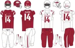 - July 10, 2018: The Arkansas athletic department released the design of the 2018 uniform, which featured small tweaks from the past few years. These changes included the elimination of matte-finish helmets in favor of a glossier "pearl cardinal" finish, removal of details on the jersey to "de-clutter" the chest area, and a new stripe design on the pants.[4]