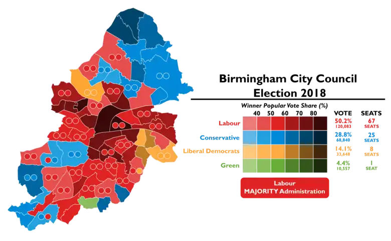 ![]() 2018 local election results in Birmingham. | |||||||||||||||||||||||||||||||||||||||||||||||||||||||||||||||||