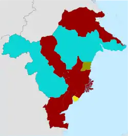 ![]() Results by regency/city. Regencies/cities won by Isran Noor are in dark red (■), Syaharie in blue (■), Andi Sofyan in gold (■), Rusmadi in yellow (■). | ||||||||||||||||||||||||||||||||||||||||||||||||