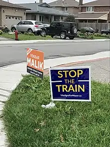 A majority of the council candidates in Ward 2 indicated support for the city's light rail transit project, including Kroetsch, Daljeet, Smith, Farr, and another 2010 challenger of Farr's, Chiarelli. Tennant and 2014 council candidate and Progressive Conservative candidate for Hamilton Centre, Vail, both opposed the project.[56] Smith's campaign focused on addressing the ward's infrastructure backlog and collaborative decision-making, Daljeet campaigned on waterfront re-development, business attraction, and transit affordability, Tennant's campaign emphasized community safety and tackling the opioid epidemic while Chiarelli emphasized community safety and sustainable development.[57]