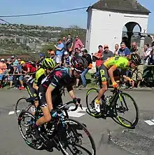 The race was run in exceptionally warm and sunny weather, with temperatures exceeding 20°C.[2] On the first ascent of the Côte de Cherave, at 35 km from the finish, Pauline Ferrand-Prévot broke clear, immediately followed by Megan Guarnier, Amanda Spratt and Janneke Ensing. They crested the first ascent of the Mur de Huy in the lead. Spanish rider Mavi García tried to bridge the gap, but was caught again before the Côte de Cherave. The leading quartet's lead rose to 40 seconds at 20 km from the end, but the unrepresented teams led the chase in the peloton and narrowed the gap to ten seconds by the foot of the final Mur de Huy.[5]