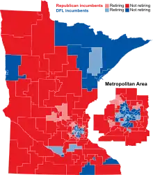Retiring incumbents (light red and light blue) by district.