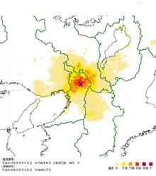 The earthquake triggered the national earthquake warning system, which set alarms approximately 3.2 seconds for the Osaka and Kyoto areas after the detection of seismic waves.[9] No tsunami waves were generated as a result of the earthquake.[2] The Japan Meteorological Agency assigned an initial magnitude of MJMA5.9, which it later upgraded to MJMA 6.1 (moment magnitude of 5.6 Mw). The earthquake registered as 6 ("lower 6") on the shindo intensity scale,[2][10] and the United States Geological Survey reported a magnitude of 5.5 Mw.[1] It was the first time a lower 6 was registered in Osaka Prefecture since 1923 when the government started to keep seismic records.[11]