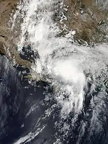 Hurricane Bud prompted the issuance of tropical cyclone watches and warnings along Baja California Sur and the northwestern coast of Mexico.[39] Strong wind gusts were recorded in Baja California,[40] causing minimal damage.[41] Despite remaining offshore for most of its track, the hurricane caused torrential rainfall and severe flooding in several regions. A peak rainfall total of 6.50 in (165 mm) was recorded in San Lorenzo, Sinaloa.[42] In Guadalajara, Jalisco, hundreds of vehicles were inundated and swept away.[43] A canal overflowed in Guadalajara, causing damage to multiple stores in a mall.[44] At least 100 additional structures were damaged in the city.[45] In Guerrero, hundreds of businesses and homes were flooded.[46] Over 100 businesses in Pie de la Cuesta were damaged by strong waves.[47] More than 60 homes in Maruata, Michoacán, experienced flood or wind damage. Heavy rainfall from Bud generated currents that swept away a child who was crossing a road in Mexico City.[48] The remnants of Bud brought moisture to drought-stricken regions of the Southwestern United States, and slowed the advance of wildfires in Colorado and Wyoming.[49][50][51]